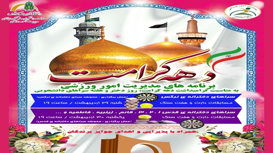 مدیریت امور ورزشی دانشگاه به مناسبت گرامیداشت دهه کرامت، روز دختر و هفته سراهای دانشجویی برنامه های متنوعی برگزار می کند.