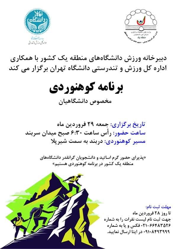 دبیرخانه ورزش دانشگاه‌های منطقه یک کشور با همکاری اداره کل ورزش و تندرستی دانشگاه تهران برنامه کوهنوردی برگزار می‌کند.