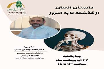 انجمن علمی دانشجویی علوم تشریح جلسه سخنرانی علمی با عنوان «داستان انسان از گذشته تا به امروز» را با سخنرانی دکتر حامد وحدتی نسب روز چهارشنبه ۲۴ اردیبهشت ماه جاری از ساعت ۱۳ تا ۱۵ در ساختمان علوم پزشکی شماره یک، طبقه ۱۰، سالن سمینار برگزار می کند.